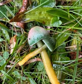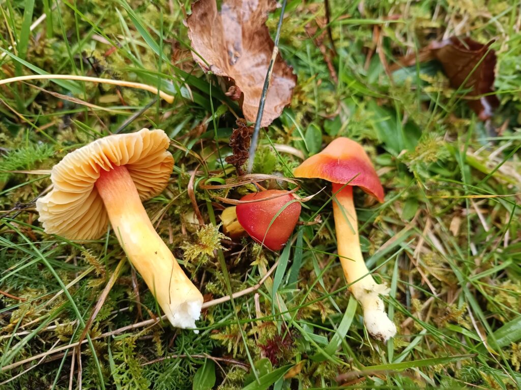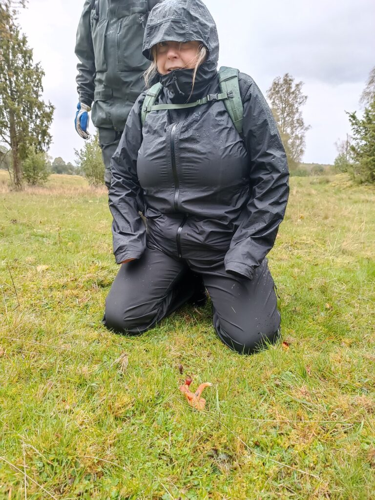 Sju tappra svampentusiaster trotsade stormen och regnet för att fynda ängssvamp. Vi gjorde en del fina fynd som praktvaxskivling, scharlakansvaxskivling, lutvaxskivling och mjölrödling. Samtliga rödlistade! Fingersvampar och jordtungor lyste tyvärr med sin frånvaro.