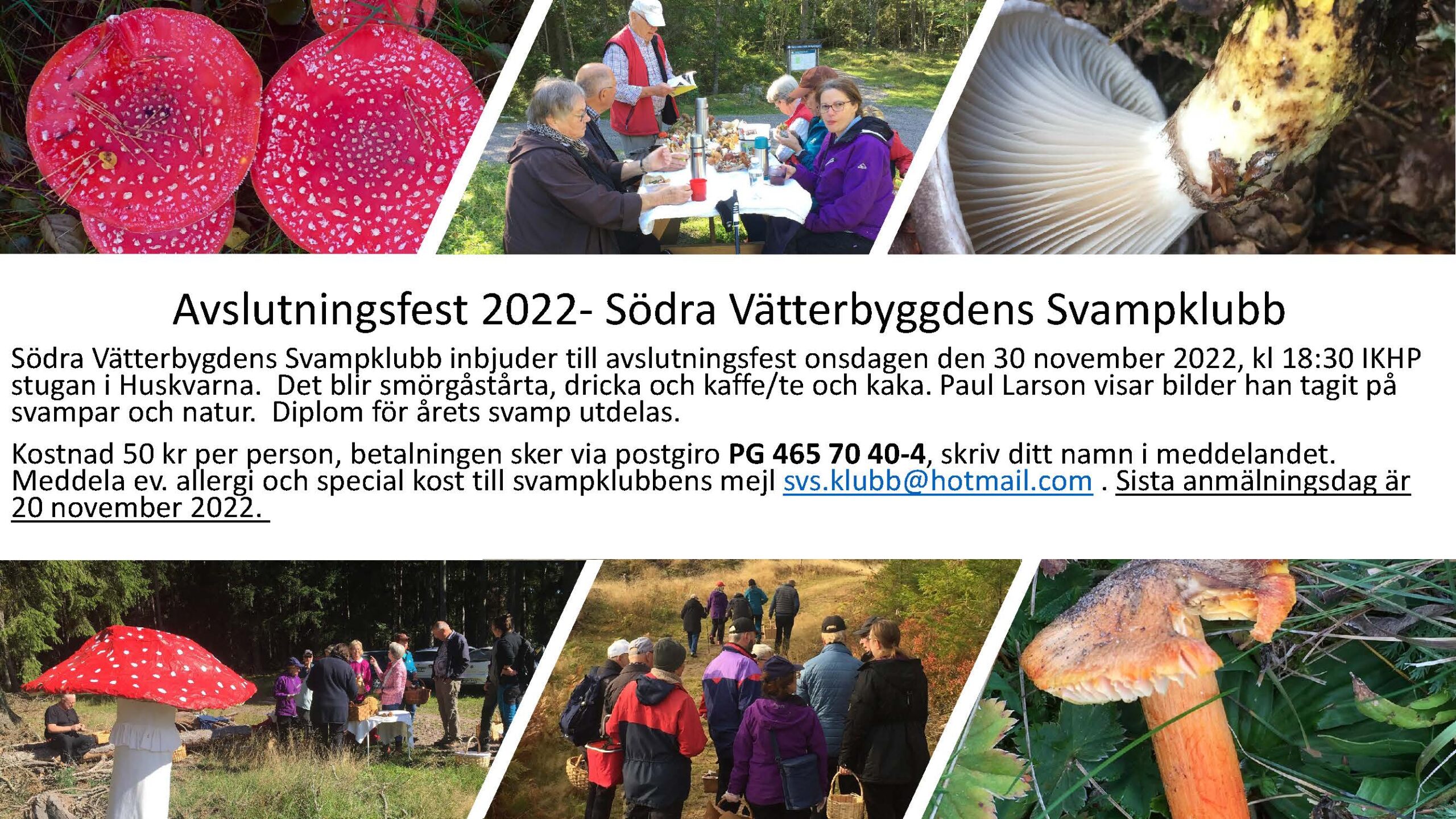 Avslutningsfest 2022- Södra Vätterbyggdens Svampklubb Published 1 november, 2022 | By Anders Hildingsson Full size is 2560 × 1440 pixels Slut 2022- Södra Vätterbyggdens Svampklubb » « IMG-4768